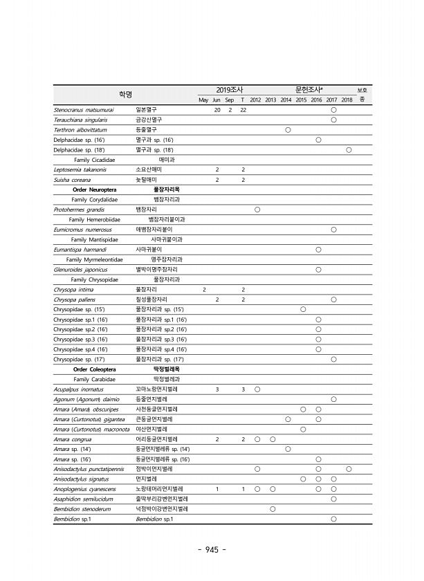 945 학명 2019조사 문헌조사* 보호 May Jun Sep T 2012 2013 2014 2015 2016 2017 2018 종 Stenocranus matsumurai 일본멸구 20 2 22 ? Terauchiana singularis 금강산멸구 ? Terthron albovittatum 등줄멸구 ? Delphacidae sp. 16‘ 멸구과 sp. 16‘ ? Delphacidae sp. 18‘ 멸구과 sp. 18‘ ? Family Cicadidae 매미과 Leptosemia takanonis 소요산매미 2 2 Suisha coreana 늦털매미 2 2 Order Neuroptera 풀잠자리목 Family Corydalidae 뱀잠자리과 Protohermes grandis 뱀잠자리 ? Family He...
