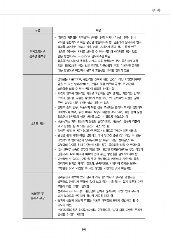 부 록 191 구분 내용 전시교육본부 심숙경 본부장 강정화 자문위원 의견보완 생태원 건립 취지나 기능인 연구, 전시 교육을 종합적으로 하는 공간을 활용하도록 함. 단순하게 실내에서 연구 결과를 보여주는 것보다 기후 변화, 미세먼지 등의 장기ㆍ중점 연구 내용을 현장에서 사례로 보여줄 수 있는 공간과 아이템을 찾는 것도 좋은 방법이므로 적극적으로 검토해주길 바람 유휴공간에 대하여 목적을 가지고 모두 활용하는 것이 좋은가에 대한 의문. 용화실못의 묵논 같은 경우도 자연스럽게 두고, 기본적인 관리만 하는 방안으로 예산이나 용역의 효율성을 고려할 필요가 있음 박용목 원장 생태원은 기본적으로, 관람객을 취하기 위한 공간이 아닌 자연생태계에서 얻을 수 있는 생태계서비스, 관찰과 체험 위주의 공간으로 자연의 소중함을 느낄...