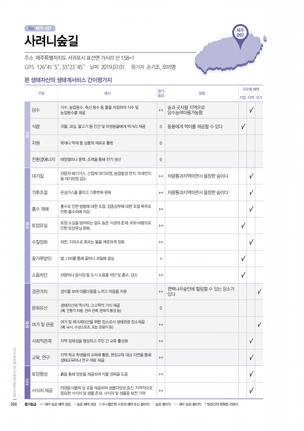 No. 제주- 제주 097 본 생태자산의 생태계서비스 간이평가지 구분 예시 평가 등급 설명 규모별 혜택 지점 지역 국가 공급 담수 식수, 농업용수, 축산 용수 등 물을 저장하여 식수 및 농업용수를 제공 ++ 숲과 곳자왈 지역으로 담수능력이용가능함 √ 식량 곡물, 과실, 물고기 등 인간 및 야생동물에게 먹거리 제공 0 동물에게 먹이를 제공할 수 있다 √ 자원 목재나 약재 등 상품의 재료로 활용 0 친환경에너지 태양열이나 풍력, 조력을 통해 전기 생산 0 조절 대기질 자동차 배기가스, 산업체 대기오염, 농업발생 먼지, 미세먼지 등 대기오염 감소 ++ 차량통과지역이면서 울창한 숲이다 √ 기후조절 온실가스를 줄이고 기후변화 완화 ++ 차량통과지역이면서 울창한 숲이다 √ 홍수 재해 홍수로 인한 범람에 대한 조절, 집...