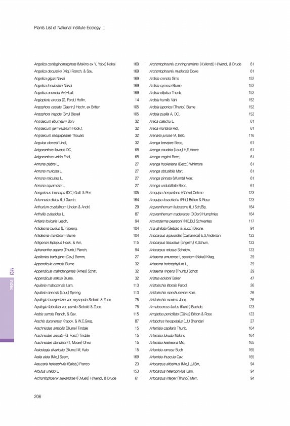 206 색인 Index Plants List of National Institute Ecology Ⅰ Angelica cartilaginomarginata Makino ex Y. Yabe Nakai 169 Angelica decursiva Miq. Franch. & Sav. 169 Angelica gigas Nakai 169 Angelica tenuissima Nakai 169 Angelica anomala Ave-Lall. 169 Angiopteris evecta G. Forst. Hoffm. 14 Angophora costata Gaertn. Hochr. ex Britten 105 Angophora hispida Sm. Blaxell 105 Angraecum eburneum Bory 32 Angraecu...