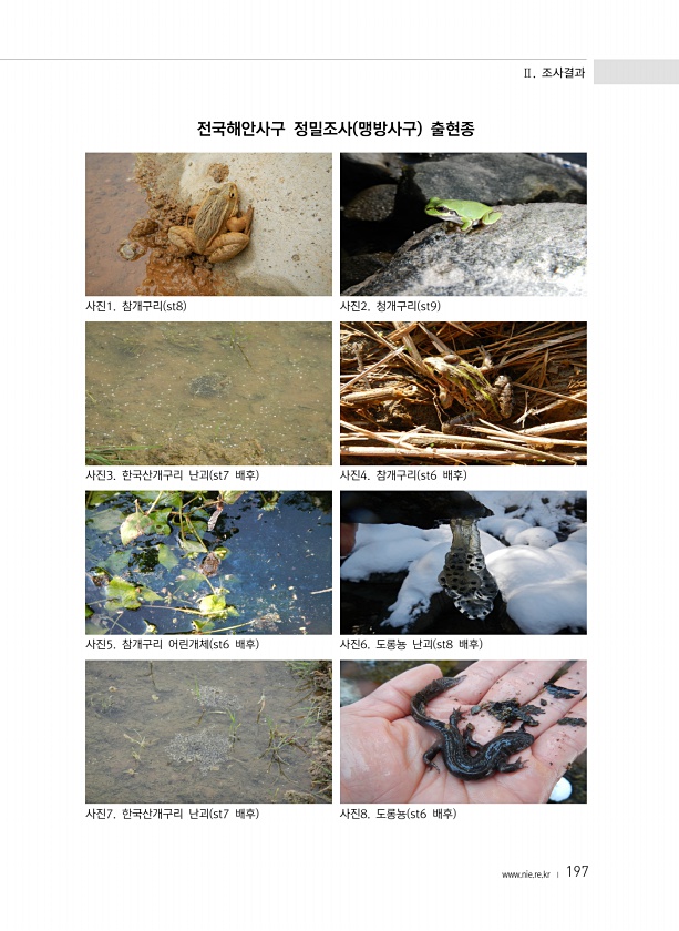 Ⅱ. 조사결과 www.nie.re.kr ? 197 전국해안사구 정밀조사 맹방사구 출현종 사진1. 참개구리 st8 사진2. 청개구리 st9 사진3. 한국산개구리 난괴 st7 배후 사진4. 참개구리 st6 배후 사진5. 참개구리 어린개체 st6 배후 사진6. 도롱뇽 난괴 st8 배후 사진7. 한국산개구리 난괴 st7 배후 사진8. 도롱뇽 st6 배후