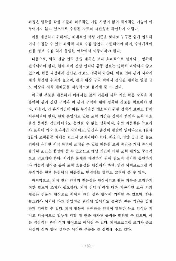과정은 명확한 작성 기준과 의무적인 기입 사항이 없어 체계적인 기술이 이 루어지지 않고 있으므로 수집된 자료의 객관성을 확신하기 어렵다. 이를 개선하기 위해서는 체계적인 작성 기준을 토대로 누구든 쉽게 입력하 거나 수집할 수 있는 과학적 자료 수집 방안이 마련되어야 하며, 수매개체에 관한 정보 수집 역시 동일한 맥락에서 이루어져야 한다. 다음으로, 퇴치 전담 인력 운영 계획은 보다 효과적으로 설계되고 명확히 관리되어야 한다. 현재 퇴치 전담 인력의 활동 정보는 명확히 파악되지 않고 있으며, 활동 과정에서 생산된 정보도 정확하지 않다. 이로 인해 관리 사각지 대가 형성될 우려가 높으며, 관리 대상 구역 밖에서 생산된 개체는 일정 규 모 이상의 서식 개체군을 지속적으로 유지해 줄 수 있다. 이러한 부분을 개선하...
