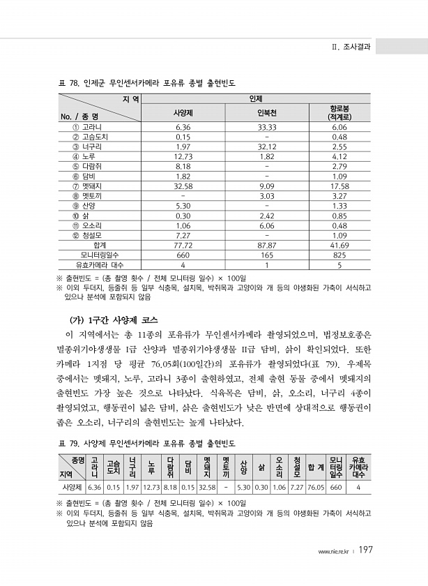Ⅱ. 조사결과 www.nie.re.kr ? 197 지 역 No. 종 명 인제 사양제 인북천 향로봉 적계로 ① 고라니 6.36 33.33 6.06 ② 고슴도치 0.15 0.48 ③ 너구리 1.97 32.12 2.55 ④ 노루 12.73 1.82 4.12 ⑤ 다람쥐 8.18 2.79 ⑥ 담비 1.82 1.09 ⑦ 멧돼지 32.58 9.09 17.58 ⑧ 멧토끼 3.03 3.27 ⑨ 산양 5.30 1.33 ⑩ 삵 0.30 2.42 0.85 ⑪ 오소리 1.06 6.06 0.48 ⑫ 청설모 7.27 1.09 합계 77.72 87.87 41.69 모니터링일수 660 165 825 유효카메라 대수 4 1 5 표 78. 인제군 무인센서카메라 포유류 종별 출현빈도 ※ 출현빈도 = 총 촬영 횟수 전체 모니터링 일수 × 100...