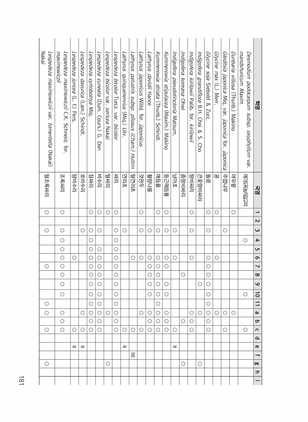 181 학명 국명 1 2 3 4 5 6 7 8 9 10 11 a b c d e f g h i Desmodium podocarpum subsp. oxyphyllum var. mandshuricum Maxim. 애기도둑놈의갈고리 ○ ○ ○ Dunbaria villosa Thunb. Makino 여우팥 ○ ○ Gleditsia japonica Miq. var. japonica for. japonica 주엽나무 ○ ○ ○ Glycine max L. Merr. 콩 ○ ○ ○ Glycine soja Siebold & Zucc. 돌콩 ○ ○ ○ ○ ○ ○ ○ ○ ○ ○ ○ Indigofera grandiflora B.H. Choi & S. Cho 큰꽃땅비싸리 ○ ○ ○ Indigofera kirilowii Palib. ...