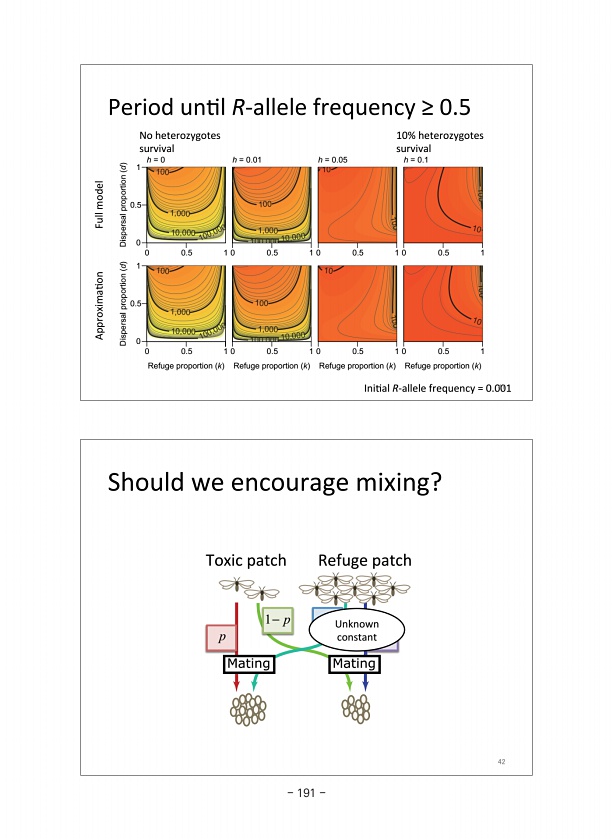 Should we encourage mixing? Emerged adults Eggs Treated area Refuge Mating Mating Toxic patch Refuge patch p ψ BB 1? p ψ BAUnknown constant 42 Period un1l R-allele frequency ≥ 0.5 A B Dispersal proportion d Refuge proportion k Dispersal proportion d Refuge proportion k Refuge proportion k Refuge proportion k h = 0 h = 0.01 h = 0.05 h = 0.1 100 1,000 10,000 100,000 0 0.5 1 0 0.5 1 100 1,000 100,000...
