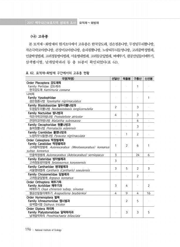 2017 백두대간보호지역 생태계 조사 묘적재 화방재 196 ? National Institute of Ecology 나 고유종 본 묘적재∼화방재의 현지조사에서 고유종은 한국강도래, 검은점좀나방, 두점밑두리뿔나방, 작은극락꼬마밤나방, 큰장미꼬마밤나방, 솔피원뿔나방, 노랑띠무늬들명나방, 고려줄딱정벌레, 민줄딱정벌레, 고려청동방아벌레, 서울병대벌레, 고려둥글잎벌레, 벼메뚜기, 팔공산밑들이메뚜기, 삼색뱁시벌, 날개알락파리 등 총 16종이 확인되었다 표 62 표 62. 묘적재화방재 구간에서의 고유종 현황 국명 학명 선달산 옥돌봉 구룡산 신선봉 Order Plecoptera 강도래목 Family Perlidae 강도래과 한국강도래 Kamimuria coreana 1 나비목 Family Ypsolophidae...