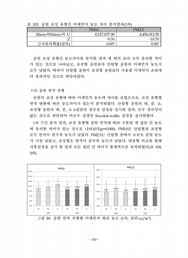 189 의 근사유의확률 양측 표 공원 조성 유형간 미세먼지 농도 차이 분석결과 차 공원 조성 유형간 농도차이를 분석한 결과 세 번의 조사 모두 유의한 차이 가 있는 것으로 나타났고 조성형 공원보다 산림형 공원의 미세먼지 농도가 모두 낮았다 따라서 산림형 공원이 조성형 공원보다 가을철 미세먼지 조절에 더 효과적인 것으로 판단되었다 나 공원 면적 유형 공원의 조성 유형에 따라 미세먼지 농도에 차이를 보였으므로 조성 유형별 면적 변화에 따른 농도차이가 있는지 분석하였다 산림형 공원의 대 중 소 조성형 공원의 대 중 소 집단의 정규성 검정을 실시한 결과 모두 정규성이 없는 것으로 판단되어 비모수 검정인 검정을 실시하였다 차 기간 분석 결과 조성 유형별 공원 면적에 따라 구분된 세 집단 간 농도 에 유의한 차이가 있...