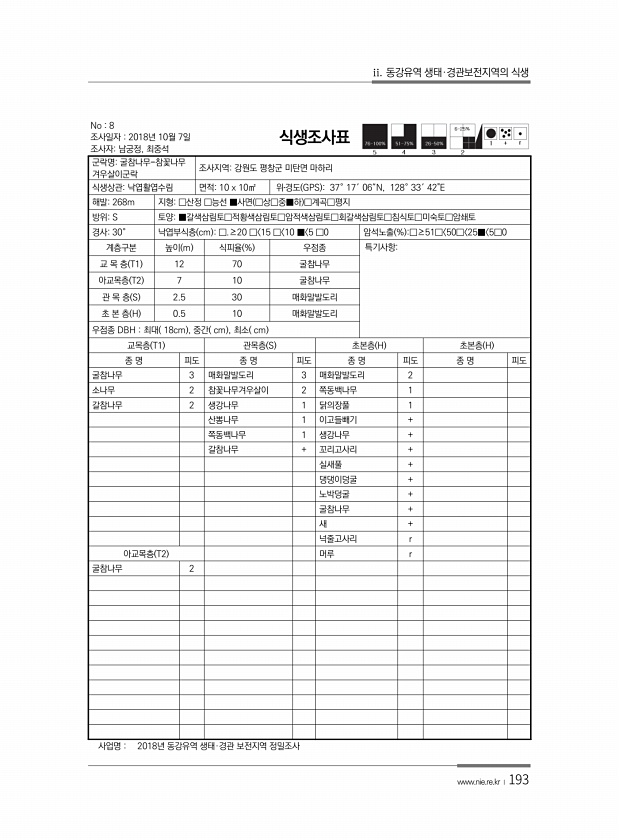 ii. 동강유역 생태·경관보전지역의 식생 www.nie.re.kr ?193 No 8 조사일자 2018년 10월 7일 조사자남궁정, 최중석 식생조사표 군락명굴참나무-참꽃나무 겨우살이군락 조사지역강원도 평창군 미탄면 마하리 식생상관낙엽활엽수림 면적10 x 10㎡ 위?경도 GPS 37° 17′ 06″N, 128° 33′ 42E 해발268m 지형□산정 □능선 ■사면 □상□중■하 □계곡□평지 방위S 토양■갈색삼림토□적황색삼림토□암적색삼림토□회갈색삼림토□침식토□미숙토□암쇄토 경사30° 낙엽부식층 cm □.≥20 □ 15 □ 10 ■ 5 □0 암석노출 % □≥51□ 50□ 25■ 5□0 계층구분 높이 m 식피율 % 우점종 특기사항교 목 층 T1 12 70 굴참나무 아교목층 T2 7 10 굴참나무 관 목 층 S 2.5 3...