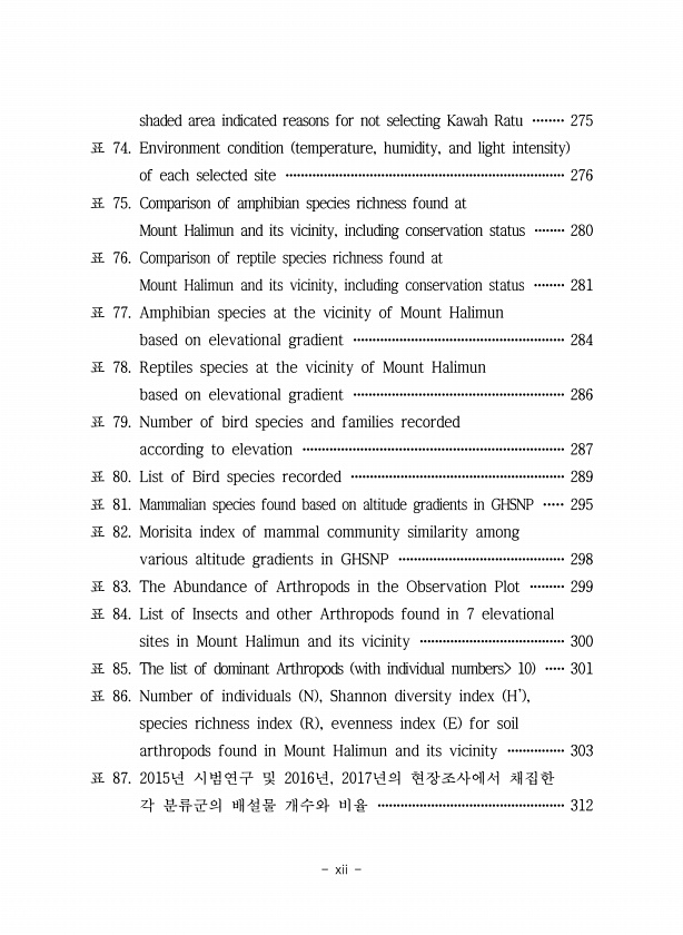 xii shaded area indicated reasons for not selecting Kawah Ratu ········275 표 74. Environment condition temperature, humidity, and light intensity of each selected site ·········································································276 표 75. Comparison of amphibian species richness found at Mount Halimun and its vicinity, including conservation status ········280 표 76. Comparison of repti...