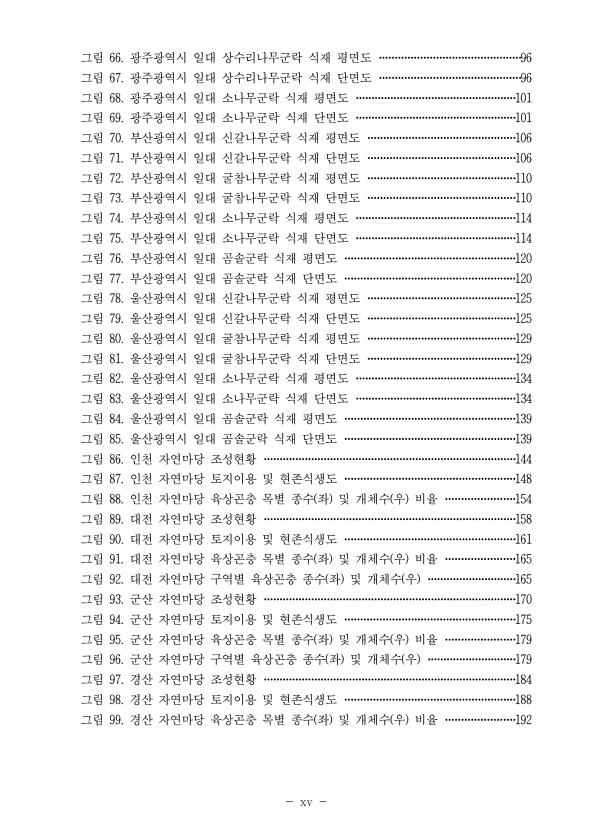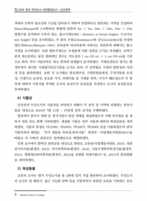 2016 전국 무인도서 자연환경조사 군산권역 8 ? National Institute of Ecology 역내의 군락의 종조성과 구조를 알아보기 위하여 균일하다고 판단되는 지역을 선정하여 Braun-Blanquet와 Z-M학파의 방법에 준하여 5m × 5m, 10m × 10m, 15m × 15m 방형구를 설치하여 수목의 밀도, 흉고직경 DBH diameter at breast height , 수고 THtree height 등을 조사하였고, 각 종의 우점도 dominance 와 군도 sociability 를 측정하 였으며 Braun-Blanquet 1964 , 교목층과 아교목층에 나타나는 목본류에 대해서는 흉고 직경을 조사하였다. 또한 현존식생도는 우점종에 의한 상관을 근거로 작성했다. 군락구 분의 최소단위는...