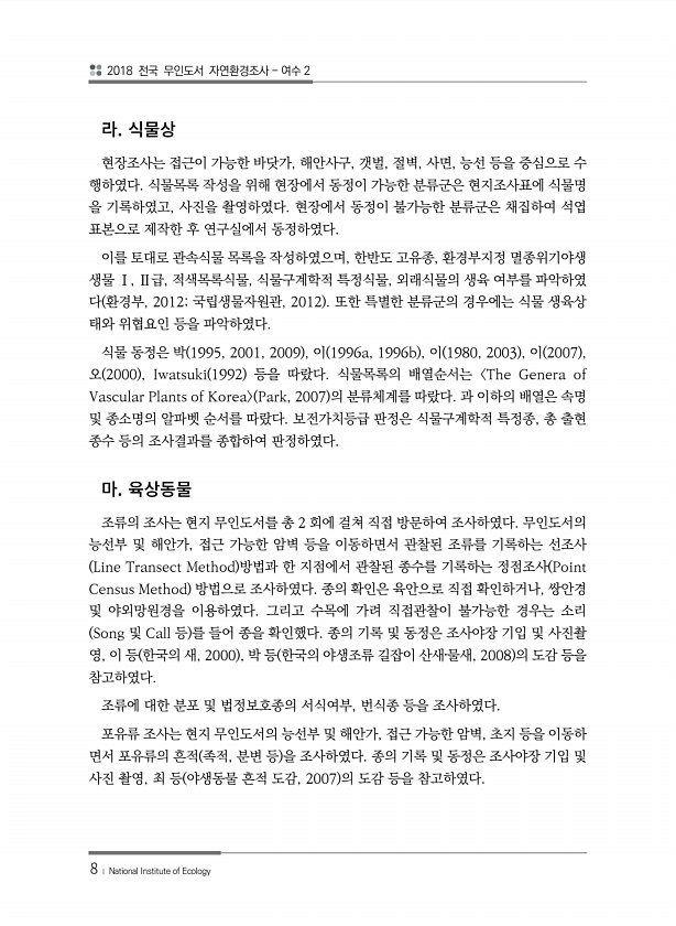 2018 전국 무인도서 자연환경조사 여수 2 8 ? National Institute of Ecology 현장조사는 접근이 가능한 바닷가, 해안사구, 갯벌, 절벽, 사면, 능선 등을 중심으로 수 행하였다. 식물목록 작성을 위해 현장에서 동정이 가능한 분류군은 현지조사표에 식물명 을 기록하였고, 사진을 촬영하였다. 현장에서 동정이 불가능한 분류군은 채집하여 석엽 표본으로 제작한 후 연구실에서 동정하였다. 이를 토대로 관속식물 목록을 작성하였으며, 한반도 고유종, 환경부지정 멸종위기야생 생물 Ⅰ, Ⅱ급, 적색목록식물, 식물구계학적 특정식물, 외래식물의 생육 여부를 파악하였 다 환경부, 2012; 국립생물자원관, 2012 또한 특별한 분류군의 경우에는 식물 생육상 태와 위협요인 등을 파악하였다. 식물 동정은 박 ...