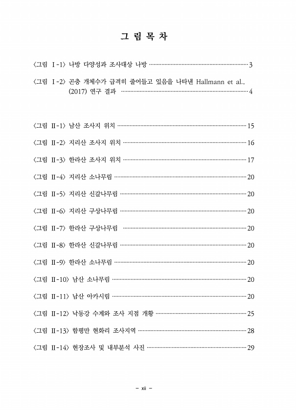 xii 그 림 목 차 그림 Ⅰ-1 나방 다양성과 조사대상 나방 ································································3 그림 Ⅰ-2 곤충 개체수가 급격히 줄어들고 있음을 나타낸 Hallmann et al., 2017 연구 결과 ··················································································4 그림 Ⅱ-1 남산 조사지 위치 ····················································································15 그림 Ⅱ-2 지리산 조사지 위치 ·································...