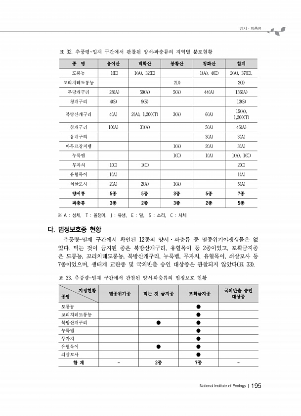 양서ㆍ파충류 National Institute of EcologyⅠ195 종 명 웅이산 백학산 봉황산 청화산 합계 도롱뇽 1 E 1 A , 32 E 1 A , 4 E 2 A , 37 E , 꼬리치레도롱뇽 2 J 2 J 무당개구리 28 A 59 A 5 A 44 A 136 A 청개구리 4 S 9 S 13 S 북방산개구리 4 A 2 A , 1,200 T 3 A 6 A 15 A , 1,200 T 참개구리 10 A 31 A 5 A 46 A 옴개구리 3 A 3 A 아무르장지뱀 1 A 2 A 3 A 누룩뱀 1 C 1 A 1 A , 1 C 무자치 1 C 1 C 2 C 유혈목이 1 A 1 A 쇠살모사 2 A 2 A 1 A 5 A 양서류 5종 5종 3종 5종 7종 파충류 3종 2종 3종 2종 5종 표 32. 추풍령밀재 구간에...