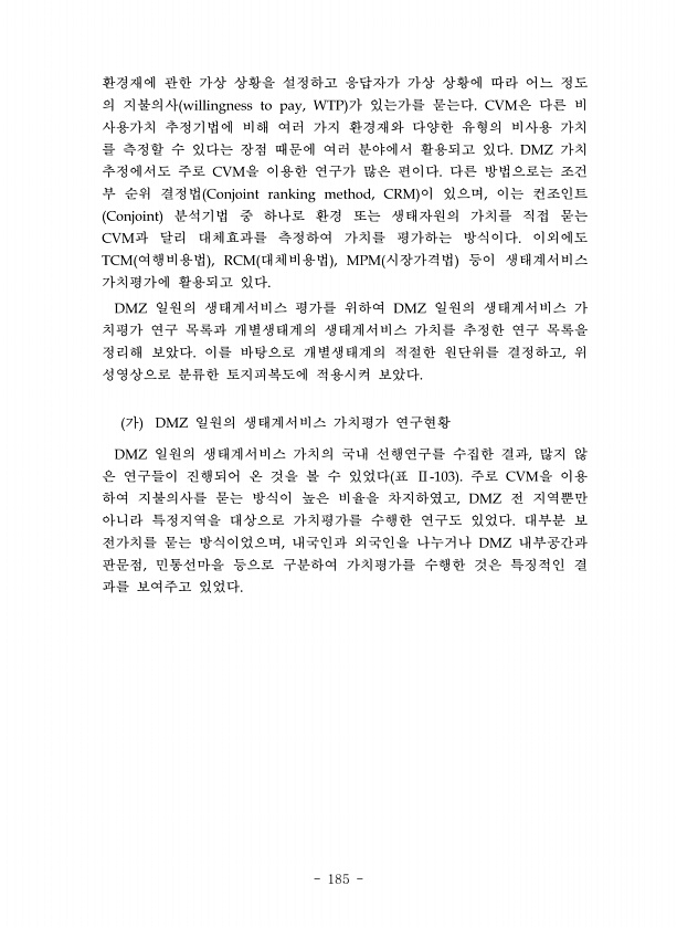 185 환경재에 관한 가상 상황을 설정하고 응답자가 가상 상황에 따라 어느 정도 의 지불의사 가 있는가를 묻는다 은 다른 비 사용가치 추정기법에 비해 여러 가지 환경재와 다양한 유형의 비사용 가치 를 측정할 수 있다는 장점 때문에 여러 분야에서 활용되고 있다 가치 추정에서도 주로 을 이용한 연구가 많은 편이다 다른 방법으로는 조건 부 순위 결정법 이 있으며 이는 컨조인트 분석기법 중 하나로 환경 또는 생태자원의 가치를 직접 묻는 과 달리 대체효과를 측정하여 가치를 평가하는 방식이다 이외에도 여행비용법 대체비용법 시장가격법 등이 생태계서비스 가치평가에 활용되고 있다 일원의 생태계서비스 평가를 위하여 일원의 생태계서비스 가 치평가 연구 목록과 개별생태계의 생태계서비스 가치를 추정한 연구 목록을 정리해 보았다 이...