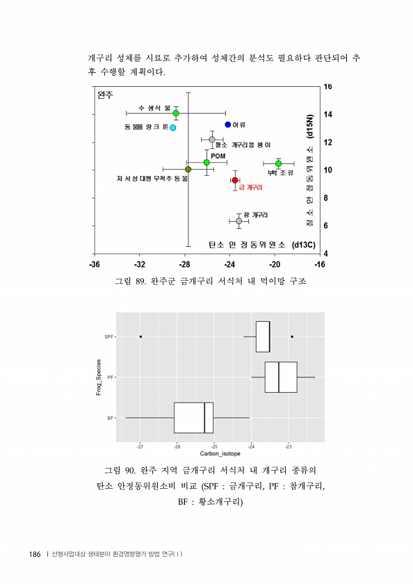 개구리 성체를 시료로 추가하여 성체간의 분석도 필요하다 판단되어 추 후 수행할 계획이다 그림 완주군 금개구리 서식처 내 먹이망 구조 그림 완주 지역 금개구리 서식처 내 개구리 종류의 탄소 안정동위원소비 비교 금개구리 참개구리 황소개구리 186 | 선형사업대상 생태분야 환경영향평가 방법 연구 Ⅰ