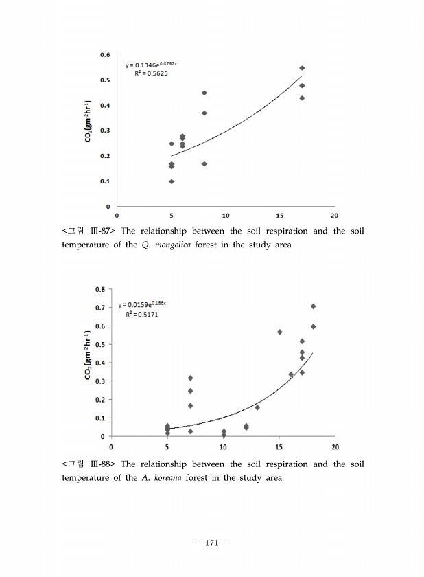 171 그림 Ⅲ-87 The relationship between the soil respiration and the soil temperature of the Q. mongolica forest in the study area 그림 Ⅲ-88 The relationship between the soil respiration and the soil temperature of the A. koreana forest in the studyarea