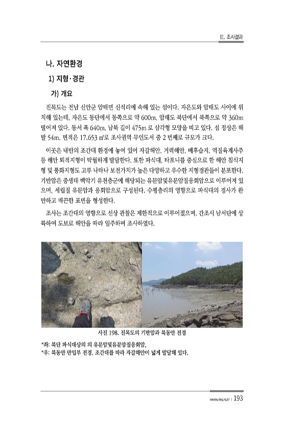 II. 조사결과 www.nie.re.kr ?193 1 · 진목도는 전남 신안군 암태면 신석리에 속해 있는 섬이다. 자은도와 암태도 사이에 위 치해 있는데, 자은도 동단에서 동쪽으로 약 600m, 암태도 북단에서 북쪽으로 약 360m 떨어져 있다. 동서 폭 640m, 남북 길이 475m 로 삼각형 모양을 띠고 있다. 섬 정상은 해 발 54m, 면적은 17,653 ㎡로 조사권역 무인도서 중 2 번째로 규모가 크다. 이곳은 내만의 조간대 환경에 놓여 있어 자갈해안, 거력해안, 배후습지, 역질육계사주 등 해안 퇴적지형이 탁월하게 발달한다. 또한 파식대, 타포니를 중심으로 한 해안 침식지 형 및 풍화지형도 고루 나타나 보전가치가 높은 다양하고 우수한 지형경관들이 분포한다. 기반암은 중생대 백악기 유천층군에 해당되는 ...