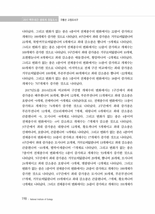 2017 백두대간 생태계 정밀조사 구룡산 고정조사구 198 ? National Institute of Ecology 나타났다. 그리고 변화가 없는 종은 4종이며 전체종수의 변화에서는 22종이 증가하고 개체수는 199개체가 증가한 것으로 나타났다. 8구간에서 최대 증가종은 거꾸로여덟팔나비 22개체, 북방꺼꾸로여덟팔나비 6개체이고 최대 감소종은 뿔나비 ?3개체로 나타났다. 그리고 변화가 없는 종은 3종이며 전체종수의 변화에서는 12종이 증가하고 개체수는 109개체가 증가한 것으로 나타났다. 9구간에서 최대 증가종은 거꾸로여덟팔나비 10개체, 조흰뱀눈나비 8개체이고 최대 감소종은 애물결나비, 황알락나비 ?2개체로 나타났다. 그리고 변화가 없는 종은 4종이며 전체종수의 변화에서는 14종이 증가하고 개체수는 60개체...