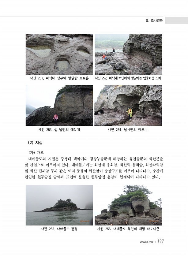 Ⅱ. 조사결과 www.nie.re.kr ? 197 사진 251. 파식대 상부에 발달한 포트홀 사진 252. 해식애 하단에서 발달하는 염풍화성 노치 사진 253. 섬 남단의 해식애 사진 254. 남서안의 타포니 2 지질 가 개요 내매물도의 지질은 중생대 백악기의 경상누층군에 해당하는 유천층군의 화산분출 및 관입으로 이루어져 있다. 내매물도에는 화산재 응회암, 화산력 응회암, 화산각력암 및 화산 집괴암 등과 같은 여러 종류의 화산암이 층상구조를 이루며 나타나고, 층간에 관입한 현무암질 암맥과 표면에 분출한 현무암질 용암이 협재되어 나타나고 있다. 사진 255. 내매물도 전경 사진 256. 내매물도 북단의 대형타포니군