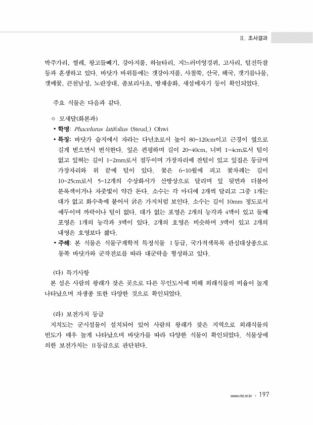 Ⅱ. 조사결과 www.nie.re.kr ? 197 박주가리, 찔레, 왕고들빼기, 강아지풀, 하늘타리, 지느러미엉겅퀴, 고사리, 털진득찰 등과 혼생하고 있다. 바닷가 바위틈에는 갯강아지풀, 사철쑥, 산국, 해국, 갯기름나물, 갯메꽃, 큰천남성, 노란장대, 좀보리사초, 땅채송화, 새섬매자기 등이 확인되었다. 주요 식물은 다음과 같다. ◇ 모새달 화본과 ? 학명Phacelurus latifolius Steud. Ohwi ? 특징바닷가 습지에서 자라는 다년초로서 높이 80120cm이고 근경이 옆으로 길게 벋으면서 번식한다. 잎은 편평하며 길이 2040cm, 너비 14cm로서 털이 없고 잎혀는 길이 12mm로서 절두이며 가장자리에 잔털이 있고 잎집은 둥글며 가장자리와 위 끝에 털이 있다. 꽃은 610월에 피고 꽃차례...