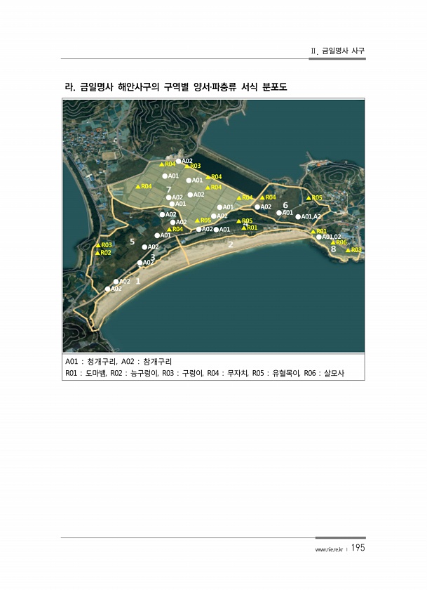 Ⅱ. 금일명사 사구 www.nie.re.kr ? 195 라. 금일명사 해안사구의 구역별 양서?파충류 서식 분포도 ▲R03 ▲R03 ▲R03 ▲R05 ▲R01 ▲R04 ▲R04 ▲R05 ▲R04 ▲R06 ▲R02 ▲R04 ▲R05 ▲R01 ▲R04 ▲R04 ●A01 ●A02 ●A02 ●A01 ●A02 ▲R04 ●A01 ●A02 ●A02 ●A01,02 ●A01 ●A02 ●A01 ●A01,A2 ●A02 ●A02 ●A02 ●A02 ●A01 ●A01 ●A02 ●A02 A01 청개구리, A02 참개구리 R01 도마뱀, R02 능구렁이, R03 구렁이, R04 무자치, R05 유혈목이, R06 살모사