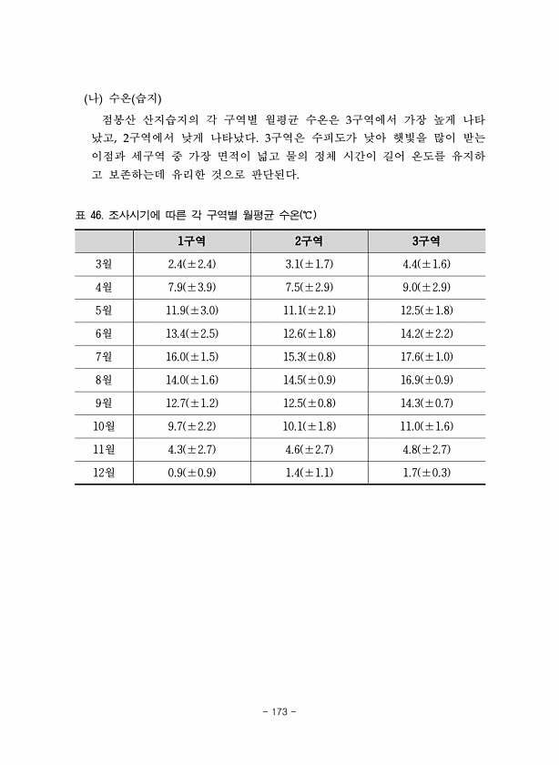 나 수온 습지 점봉산 산지습지의 각 구역별 월평균 수온은 3구역에서 가장 높게 나타 났고, 2구역에서 낮게 나타났다. 3구역은 수피도가 낮아 햇빛을 많이 받는 이점과 세구역 중 가장 면적이 넓고 물의 정체 시간이 길어 온도를 유지하 고 보존하는데 유리한 것으로 판단된다. 1구역 2구역 3구역 3월 2.4 ±2.4 3.1 ±1.7 4.4 ±1.6 4월 7.9 ±3.9 7.5 ±2.9 9.0 ±2.9 5월 11.9 ±3.0 11.1 ±2.1 12.5 ±1.8 6월 13.4 ±2.5 12.6 ±1.8 14.2 ±2.2 7월 16.0 ±1.5 15.3 ±0.8 17.6 ±1.0 8월 14.0 ±1.6 14.5 ±0.9 16.9 ±0.9 9월 12.7 ±1.2 12.5 ±0.8 14.3 ±0.7 10월 9.7 ±2....