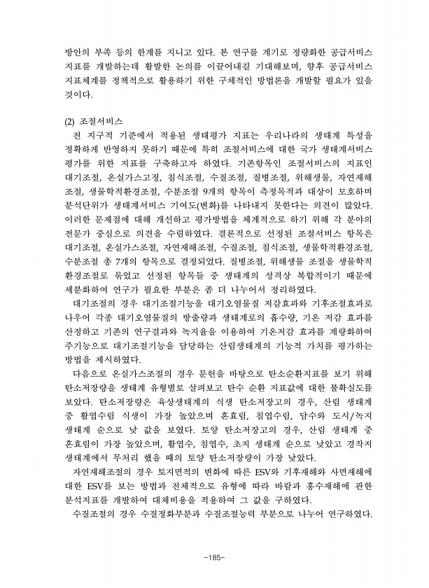 -185- 방안의 부족 등의 한계를 지니고 있다 본 연구를 계기로 정량화한 공급서비스 지표를 개발하는데 활발한 논의를 이끌어내길 기대해보며 향후 공급서비스 지표체계를 정책적으로 활용하기 위한 구체적인 방법론을 개발할 필요가 있을 것이다 조절서비스 전 지구적 기준에서 적용된 생태평가 지표는 우리나라의 생태계 특성을 정확하게 반영하지 못하기 때문에 특히 조절서비스에 대한 국가 생태계서비스 평가를 위한 지표를 구축하고자 하였다 기존항목인 조절서비스의 지표인 대기조절 온실가스고정 침식조절 수질조절 질병조절 위해생물 자연재해 조절 생물학적환경조절 수분조절 개의 항목이 측정목적과 대상이 모호하며 분석단위가 생태계서비스 기여도 변화 를 나타내지 못한다는 의견이 많았다 이러한 문제점에 대해 개선하고 평가방법을 체계적으로 ...