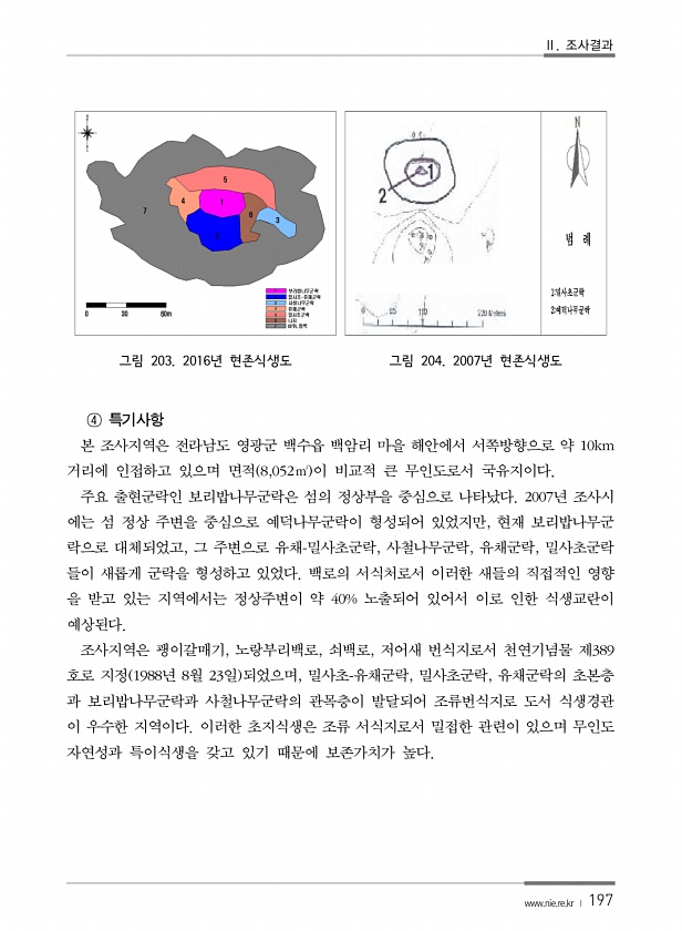 Ⅱ. 조사결과 www.nie.re.kr ? 197 그림 203. 2016년 현존식생도 그림 204. 2007년 현존식생도 ④ 특기사항 본 조사지역은 전라남도 영광군 백수읍 백암리 마을 해안에서 서쪽방향으로 약 10km 거리에 인접하고 있으며 면적 8,052㎡ 이 비교적 큰 무인도로서 국유지이다. 주요 출현군락인 보리밥나무군락은 섬의 정상부을 중심으로 나타났다. 2007년 조사시 에는 섬 정상 주변을 중심으로 예덕나무군락이 형성되어 있었지만, 현재 보리밥나무군 락으로 대체되었고, 그 주변으로 유채-밀사초군락, 사철나무군락, 유채군락, 밀사초군락 들이 새롭게 군락을 형성하고 있었다. 백로의 서식처로서 이러한 새들의 직접적인 영향 을 받고 있는 지역에서는 정상주변이 약 40% 노출되어 있어서 이로 인한 식생교란이...