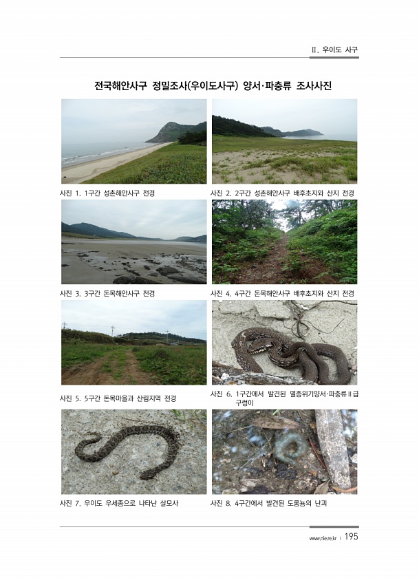 Ⅱ. 우이도 사구 www.nie.re.kr ? 195 전국해안사구 정밀조사 우이도사구 양서·파충류 조사사진 사진 1. 1구간 성촌해안사구 전경 사진 2. 2구간 성촌해안사구 배후초지와 산지 전경 사진 3. 3구간 돈목해안사구 전경 사진 4. 4구간 돈목해안사구 배후초지와 산지 전경 사진 5. 5구간 돈목마을과 산림지역 전경 사진 6. 1구간에서 발견된 멸종위기양서·파충류Ⅱ급 구렁이 사진 7. 우이도 우세종으로 나타난 살모사 사진 8. 4구간에서 발견된 도롱뇽의난괴