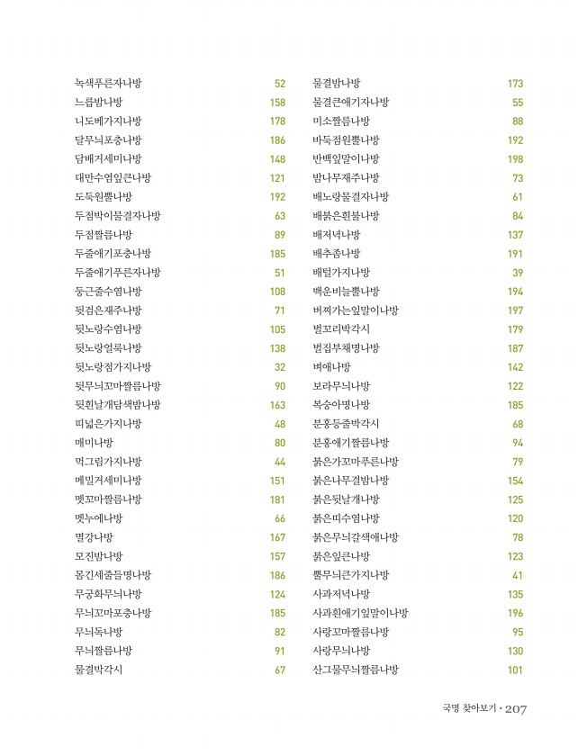 국명 찾아보기?207 녹색푸른자나방 52 느릅밤나방 158 니도베가지나방 178 달무늬포충나방 186 담배거세미나방 148 대만수염잎큰나방 121 도둑원뿔나방 192 두점박이물결자나방 63 두점짤름나방 89 두줄애기포충나방 185 두줄애기푸른자나방 51 둥근줄수염나방 108 뒷검은재주나방 71 뒷노랑수염나방 105 뒷노랑얼룩나방 138 뒷노랑점가지나방 32 뒷무늬꼬마짤름나방 90 뒷흰날개담색밤나방 163 띠넓은가지나방 48 매미나방 80 먹그림가지나방 44 메밀거세미나방 151 멧꼬마짤름나방 181 멧누에나방 66 멸강나방 167 모진밤나방 157 몸긴세줄들명나방 186 무궁화무늬나방 124 무늬꼬마포충나방 185 무늬독나방 82 무늬짤름나방 91 물결박각시 67 물결밤나방 173 물결큰애기자나방 55 미소...