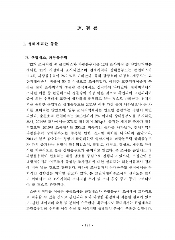 181 Ⅳ. 결 론 1. 생태계교란 동물 가. 큰입배스, 파랑볼우럭 12개 조사지점 중 큰입배스와 파랑볼우럭은 12개 조사지점 중 양양남대천을 제외한 11개 지점에서 조사되었으며 전체지역의 상대풍부도는 큰입배스가 11.4%, 파랑볼우럭이 26.2 %로 나타났다. 특히 팔당호와 대청호, 제주도는 교 란외래어종의 비율이 50 % 이상으로 조사되었다. 이러한 교란외래어종의 우 점은 전체 조사지역의 생물량 분석에서도 심각하게 나타났다. 전체지역에서 조사된 어종 중 큰입배스의 생물량이 가장 많은 것으로 확인되어 교란외래어 종에 의한 수생태계 교란이 심각하게 발생되고 있는 것으로 나타났다. 전체지 역을 종합한 큰입배스 상대풍부도는 2011년 이후 가장 높게 나타났으나 큰 차 이를 보이지는 않았으며, 일부 조사지역에서는...