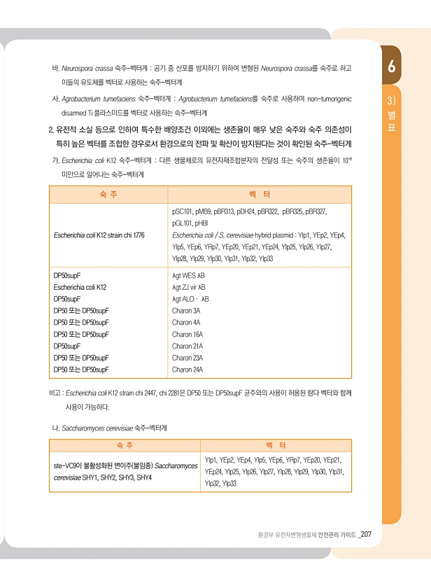 환경부 유전자변형생물체 안전관리 가이드 _207 6 별 표 3 바. Neurospora crassa 숙주-벡터계 공기 중 산포를 방지하기 위하여 변형된 Neurospora crassa를 숙주로 하고 이들의 유도체를 벡터로 사용하는 숙주-벡터계 사. Agrobacterium tumefaciens 숙주-벡터계 Agrobacterium tumefaciens를 숙주로 사용하여 non-tumorigenic disarmed Ti 플라스미드를 벡터로 사용하는 숙주-벡터계 2. 유전적 소실 등으로 인하여 특수한 배양조건 이외에는 생존율이 매우 낮은 숙주와 숙주 의존성이 특히 높은 벡터를 조합한 경우로서 환경으로의 전파 및 확산이 방지된다는 것이 확인된 숙주-벡터계 가. Escherichia coli K12 숙주-벡터계 다...