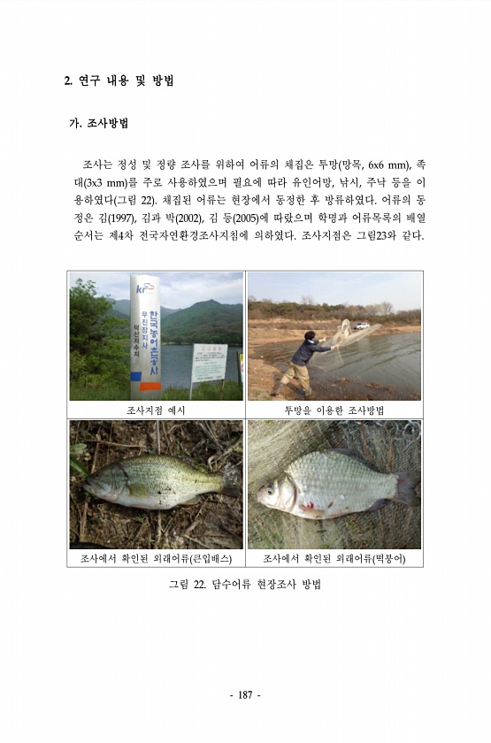 187 2. 연구 내용 및 방법 가. 조사방법 조사는 정성 및 정량 조사를 위하여 어류의 채집은 투망 망목, 6x6 mm , 족 대 3x3 mm 를 주로 사용하였으며 필요에 따라 유인어망, 낚시, 주낙 등을 이 용하였다 그림 22 채집된 어류는 현장에서 동정한 후 방류하였다. 어류의 동 정은 김 1997 , 김과 박 2002 , 김 등 2005 에 따랐으며 학명과 어류목록의 배열 순서는 제4차 전국자연환경조사지침에 의하였다. 조사지점은 그림23와 같다. 조사지점 예시 투망을 이용한 조사방법 조사에서 확인된 외래어류 큰입배스 조사에서 확인된 외래어류 떡붕어 그림 22. 담수어류 현장조사방법