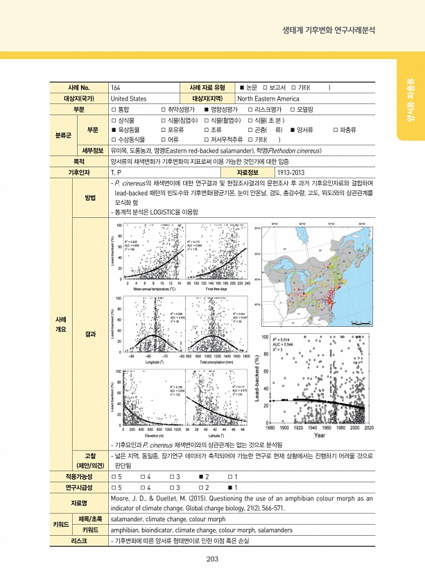 203 생태계 기후변화 연구사례분석 양서류·파충류 사례 No. 164 사례 자료 유형 ■ 논문 □ 보고서 □ 기타 대상지 국가 United States 대상지 지역 North Eastern America 부문 □ 통합 □ 취약성평가 ■ 영향성평가 □ 리스크평가 □ 모델링 분류군 부문 □ 상식물 □ 식물 침엽수 □ 식물 활엽수 □ 식물 초 본 ■ 육상동물 □ 포유류 □ 조류 □ 곤충 류 ■ 양서류 □ 파충류 □ 수상동식물 □ 어류 □ 저서무척추류 □ 기타 세부정보 유미목, 도롱뇽과, 영명 Eastern red-backed salamander , 학명 Plethodon cinereus 목적 양서류의 채색변화가 기후변화의 지표로써 이용 가능한 것인가에 대한 입증 기후인자 T, P 자료정보 1913-2013 사례 ...