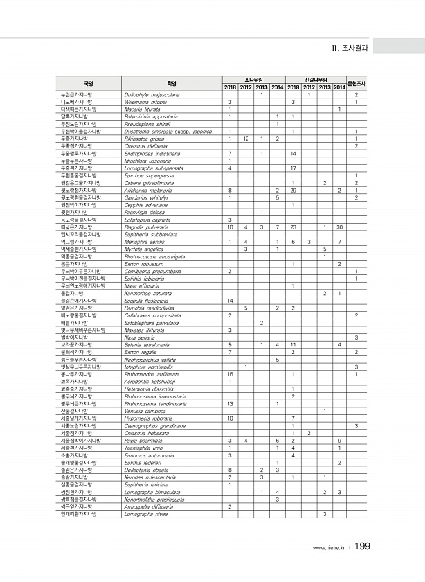 Ⅱ. 조사결과 www.nie.re.kr ? 199 국명 학명 소나무림 신갈나무림 문헌조사 2018 2012 2013 2014 2018 2012 2013 2014 누런큰가지나방 Duliophyle majuscularia 1 1 2 니도베가지나방 Wilemania nitobei 3 3 1 다색띠큰가지나방 Macaria liturata 1 1 담흑가지나방 Polymixinia appositaria 1 1 1 두점노랑가지나방 Pseudepione shiraii 1 두점박이물결자나방 Dysstroma cinereata subsp. japonica 1 1 1 두줄가지나방 Rikiosatoa grisea 1 12 1 2 1 두줄점가지나방 Chiasmia defixaria 2 두줄짤룩가지나방 Endropiodes indi...