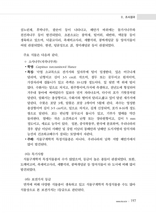 Ⅱ. 조사결과 www.nie.re.kr ? 197 섬노린재, 후박나무, 팔손이 등이 나타나고, 해안가 바위에는 돌가시나무와 천선과나무 등이 발견되었다. 초본으로는 참억새, 털머위, 대반하, 맥문동 등이 생육하고 있으며, 넉줄고사리, 족제비고사리, 세뿔석위, 콩짜개덩굴 등 양치식물이 여럿 관찰되었다. 한편, 덩굴성으로 칡, 청미래덩굴 등이 관찰되었다. 주요 식물은 다음과 같다. ◇ 소사나무 자작나무과 ? 학명Carpinus turczaninovii Hance ? 특징낙엽 소교목으로 잔가지와 잎자루에 털이 밀생한다. 잎은 어긋나게 달리며, 난형이고 길이 3-5 cm로 작으며, 첨두 또는 둔두이고 원저이며, 가장자리에 겹톱니가 있고 측맥은 10-12쌍 정도이다. 잎 뒷면 맥 위에 털이 많다. 수화서는 밑으로 처지...