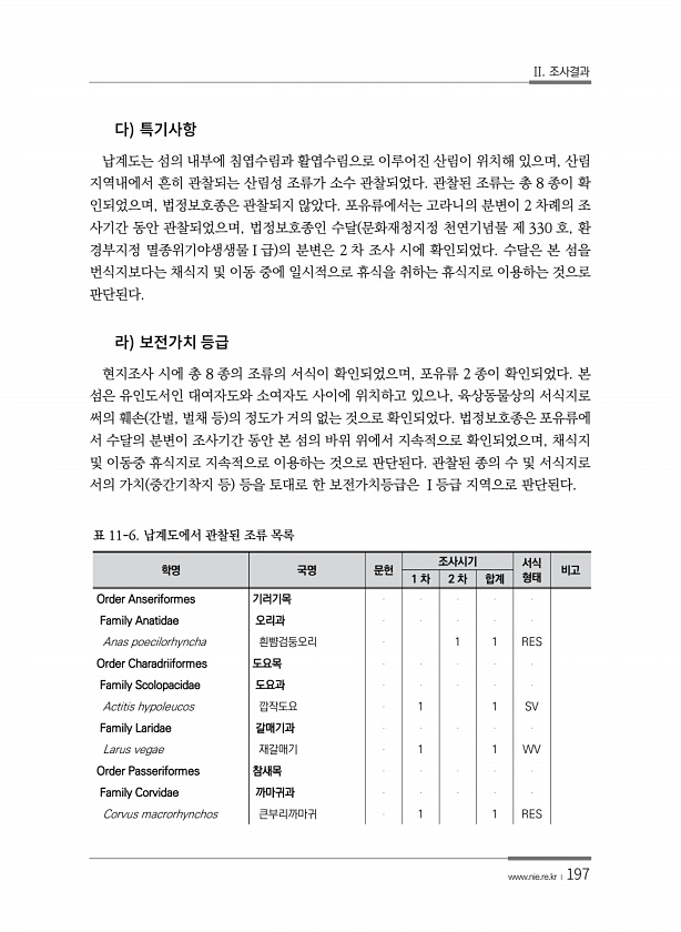 II. 조사결과 www.nie.re.kr ?197 납계도는 섬의 내부에 침엽수림과 활엽수림으로 이루어진 산림이 위치해 있으며, 산림 지역내에서 흔히 관찰되는 산림성 조류가 소수 관찰되었다. 관찰된 조류는 총 8 종이 확 인되었으며, 법정보호종은 관찰되지 않았다. 포유류에서는 고라니의 분변이 2 차례의 조 사기간 동안 관찰되었으며, 법정보호종인 수달 문화재청지정 천연기념물 제 330 호, 환 경부지정 멸종위기야생생물Ⅰ급 의 분변은 2 차 조사 시에 확인되었다. 수달은 본 섬을 번식지보다는 채식지 및 이동 중에 일시적으로 휴식을 취하는 휴식지로 이용하는 것으로 판단된다. 현지조사 시에 총 8 종의 조류의 서식이 확인되었으며, 포유류 2 종이 확인되었다. 본 섬은 유인도서인 대여자도와 소여자도 사이에 위치하고 있...