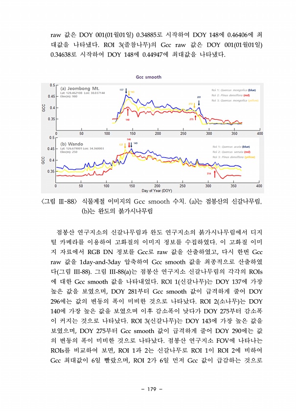 179 raw 값은 DOY 001 01월01일 0.34885로 시작하여 DOY 148에 0.46406에 최 대값을 나타냈다. ROI 3 졸참나무 의 Gcc raw 값은 DOY 001 01월01일 0.34638로 시작하여 DOY 148에 0.44947에 최대값을 나타냈다. 그림 Ⅲ-88 식물계절 이미지의 Gcc smooth 수치. a 는 점봉산의 신갈나무림, b 는 완도의 붉가시나무림 점봉산 연구지소의 신갈나무림과 완도 연구지소의 붉가시나무림에서 디지 털 카메라를 이용하여 고화질의 이미지 정보를 수집하였다. 이 고화질 이미 지 자료에서 RGB DN 정보를 Gcc로 raw 값을 산출하였고, 다시 한번 Gcc raw 값을 1day-and-3day 압축하여 Gcc smooth 값을 최종적으로 산출하였 다 그림 II...