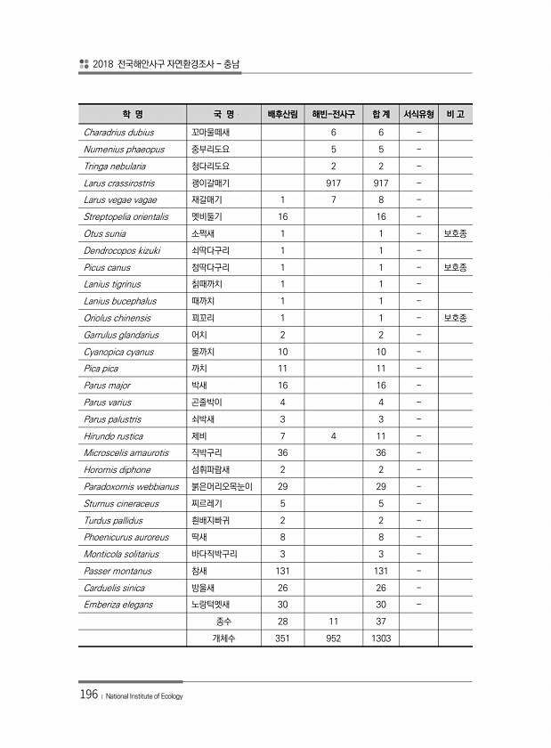 2018 전국해안사구 자연환경조사 충남 196 ? National Institute of Ecology 학 명 국 명 배후산림 해빈-전사구 합 계 서식유형 비 고 Charadrius dubius 꼬마물떼새 6 6 Numenius phaeopus 중부리도요 5 5 Tringa nebularia 청다리도요 2 2 Larus crassirostris 괭이갈매기 917 917 Larus vegae vagae 재갈매기 1 7 8 Streptopelia orientalis 멧비둘기 16 16 Otus sunia 소쩍새 1 1 보호종 Dendrocopos kizuki 쇠딱다구리 1 1 Picus canus 청딱다구리 1 1 보호종 Lanius tigrinus 칡때까치 1 1 Lanius bucephalus 때까치 1 ...