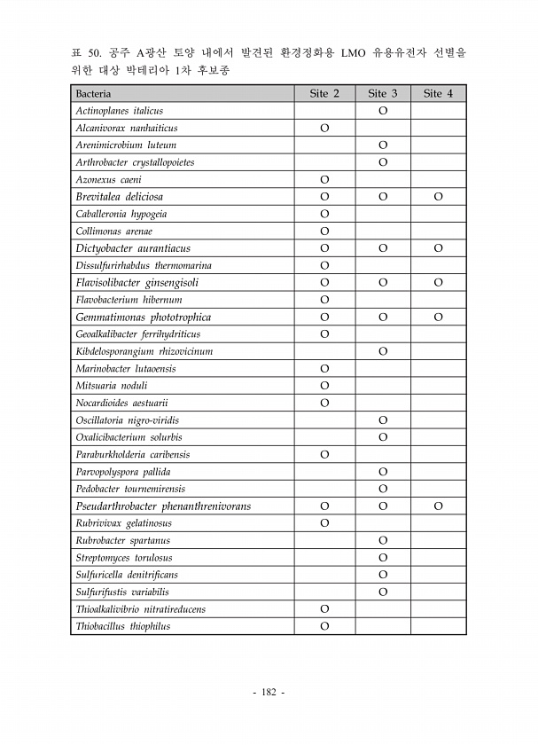 182 Bacteria Site 2 Site 3 Site 4 Actinoplanes italicus O Alcanivorax nanhaiticus O Arenimicrobium luteum O Arthrobacter crystallopoietes O Azonexus caeni O Brevitalea deliciosa O O O Caballeronia hypogeia O Collimonas arenae O Dictyobacter aurantiacus O O O Dissulfurirhabdus thermomarina O Flavisolibacter ginsengisoli O O O Flavobacterium hibernum O Gemmatimonas phototrophica O O O Geoalkalibacte...