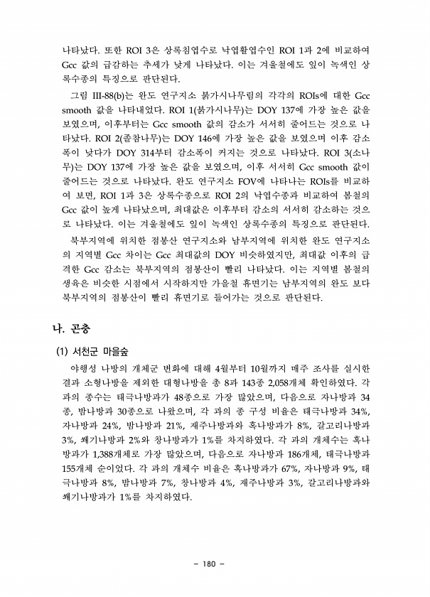 180 나타났다. 또한 ROI 3은 상록침엽수로 낙엽활엽수인 ROI 1과 2에 비교하여 Gcc 값의 급감하는 추세가 낮게 나타났다. 이는 겨울철에도 잎이 녹색인 상 록수종의 특징으로 판단된다. 그림 III-88 b 는 완도 연구지소 붉가시나무림의 각각의 ROIs에 대한 Gcc smooth 값을 나타내었다. ROI 1 붉가시나무 는 DOY 137에 가장 높은 값을 보였으며, 이후부터는 Gcc smooth 값의 감소가 서서히 줄어드는 것으로 나 타났다. ROI 2 졸참나무 는 DOY 146에 가장 높은 값을 보였으며 이후 감소 폭이 낮다가 DOY 314부터 감소폭이 커지는 것으로 나타났다. ROI 3 소나 무 는 DOY 137에 가장 높은 값을 보였으며, 이후 서서히 Gcc smooth 값이 줄어드는 것으로 나...
