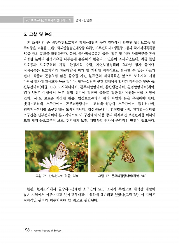 2018 백두대간보호지역 생태계 조사 댓재 삽당령 198 ? National Institute of Ecology 5. 고찰 및 논의 본 조사기간 중 백두대간보호지역 댓재삽당령 구간 일대에서 확인된 법정보호종 및 주요종은 고유종 10종, 국외반출승인대상종 64종, 기후변화지표생물종 2종과 국가적색목록종 59종 등의 분포를 확인하였다. 특히, 국가적색목록은 중국, 일본 및 여타 사례연구를 통해 다양한 분야의 환경이슈를 다루는데 유용하게 활용되고 있음이 조사되었는데, 예를 들면 보호종과 보호구역의 지정, 환경계획 수립, 자연보전정책의 효과성 평가 등이다. 적색목록은 보호지역의 생물다양성 평가 및 계획에 객관적으로 활용할 수 있는 자료가 된다. 식물과 곤충처럼 많은 종수를 가진 분류군의 적색목록은 앞으로 보호지역...