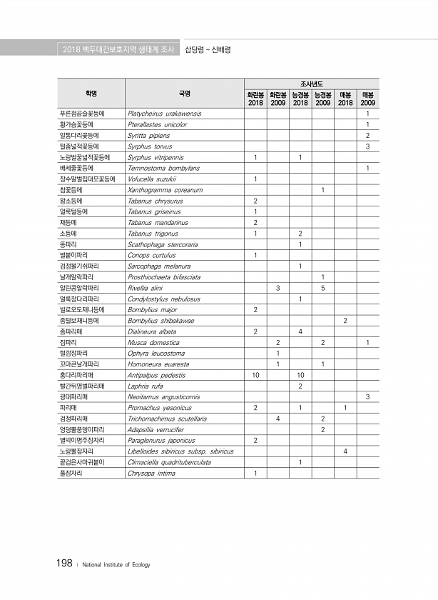 2018 백두대간보호지역 생태계 조사 삽당령 신배령 198 ? National Institute of Ecology 학명 국명 조사년도 화란봉 2018 화란봉 2009 능경봉 2018 능경봉 2009 매봉 2018 매봉 2009 푸른점곱슬꽃등에 Platycheirus urakawensis 1 황가슴꽃등에 Pterallastes unicolor 1 알통다리꽃등에 Syritta pipiens 2 털좀넓적꽃등에 Syrphus torvus 3 노랑벌꿀넓적꽃등에 Syrphus vitripennis 1 1 배세줄꽃등에 Temnostoma bombylans 1 장수말벌집대모꽃등에 Volucella suzukii 1 참꽃등에 Xanthogramma coreanum 1 왕소등에 Tabanus chrysurus 2 얼룩털등에...