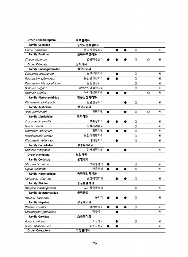196 Order Ephemeroptera 하루살이목 Family Caenidae 등딱지하루살이과 Caenis nishinoae 등딱지하루살이 ● ● ◎ ? Family Baetidae 꼬마하루살이과 Cloeon dipterum 연못하루살이 ● ● ● ◎ ◎ ? Order Odonata 잠자리목 Family Coenagrionoidae 실잠자리과 Ceriagrion melanurum 노란실잠자리 ● ◎ ? Paracercion calamorum 등검은실잠자리 ● ● ◎ ? Paracercion hieroglyphicum 등줄실잠자리 ◎ ? Ischnura elegans 북방아시아실잠자리 ◎ ? Ischnura asiatica 아시아실잠자리 ● ● ● ◎ ? Family Platycnemididae 방울실잠자...