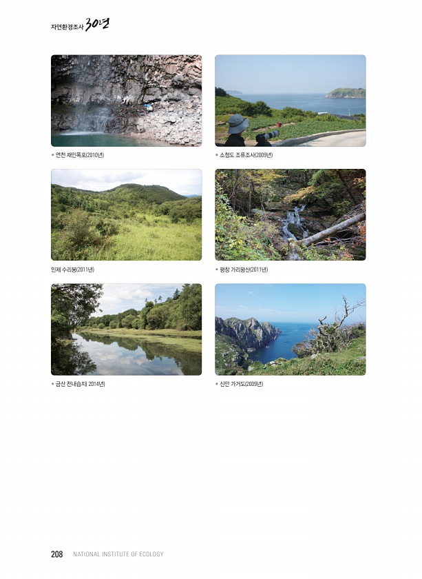 ? 연천 재인폭포 2010년 ? 금산 천내습지 2014년 ? 소청도 조류조사 2009년 ? 신안 가거도 2009년 인제 수리봉 2011년 ? 평창 가리왕산 2011년 208 NATIONAL INSTITUTE OF ECOLOGY자연환경조사30년
