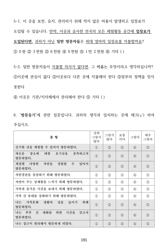 191 5-1. 이 곳을 보전, 유지, 관리하기 위해 적지 않은 비용이 발생하고 입장료가 도입될 수 있습니다. 만약, 이곳과 유사한 전국의 모든 체험활동 공간에 입장료가 도입된다면, 귀하가 아닌 일반 방문자들은 최대 얼마의 입장료를 지불할까요? ① 0 원 ② 3 천원 ③ 6 천원 ④ 9 천원 ⑤ 1 만 2 천원 ⑥ 기타 5-2. 일반 방문자들이 지불할 의사가 없다면, 그 이유는 무엇이라고 생각하십니까? ①이곳에 관심이 없다 ②이곳보다 다른 곳에 지불해야 한다 ③정부의 정책을 믿지 못한다 ④ 이곳은 기관/지자체에서 관리해야 한다 ⑤ 기타 6. ‘방문동기’에 관한 질문입니다. 귀하의 생각과 일치하는 곳에 체크 √ 하여 주십시오. 문 항 전혀 그렇지 않다 그렇지 않다 보통 이다 그렇다 그렇다 매우 신기한 것을 체...