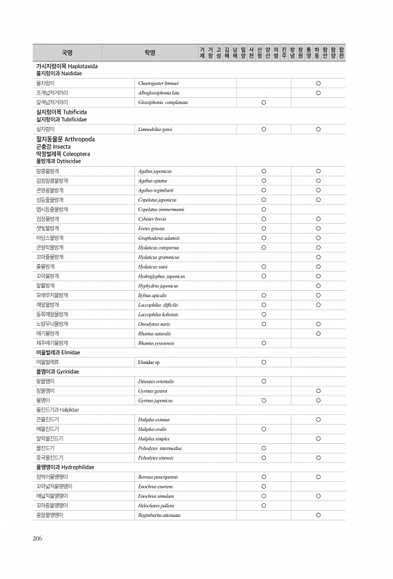 206 가시지렁이목 Haplotaxida 물지렁이과 Naididae 물지렁이 Chaetogaster limnaei ○ 조개넙적거머리 Alboglossiphonia lata ○ 갈색넙적거머리 Glossiphonia complanata ○ 실지렁이목 Tubificida 실지렁이과 Tubificidae 실지렁이 Limnodrilus gotoi ○ ○ 절지동물문 Arthropoda 곤충강 Insecta 딱정벌레목 Coleoptera 물방개과 Dytiscidae 땅콩물방개 Agabus japonicus ○ ○ 검정땅콩물방개 Agabus optatus ○ ○ 큰땅콩물방개 Agabus regimbarti ○ ○ 섬등줄물방개 Copelatus japonicus ○ ○ 맵시등줄물방개 Copelatus zimmermanni ...