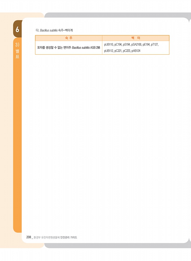 208 _ 환경부 유전자변형생물체 안전관리 가이드 6 별 표 3 다. Bacillus subtilis 숙주-벡터계 숙 주 벡 터 포자를 생성할 수 없는 변이주 Bacillus subtilis ASB 298 pUB110, pC194, pS194, pSA2100, pE194, pT127, pUB112, pC221, pC223,pAB124