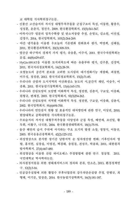 교 대학원 석사학위청구논문 신불산 고산습지의 저서성 대형무척추동물 군집구조의 특성 이동한 황종우 성성훈 윤춘식 정선우 한국환경학회지 아까시나무 임분의 임목수확량 및 탄소저장량 추정 손영모 김소원 이선정 김정수 한국임학회지 야간 냉각율을 이용한 우포늪의 기온변화 완화효과 평가 박명희 김해동 한국환경과학회지 영산강 하구역의 경제적 가치 평가 유승훈 이주석 한국수자원학회논 문집 을 이용한 토지피복도에 따른 유출부하 평가 김주훈 김경탁 한국지리정보학회지 오염농도의 공간적 분포를 고려한 도시림의 대기정화기능 계량화 최철현 이우성 정성관 한국지리정보학회지 우리나라 산림과 도시지역의 이산화질소 농도의 시 공간적 패턴 이승우 이 충화 한국농림기상학회지 우리나라 산림토양의 모암별 이화학적 특성 정진현 김춘식 구교상 이충화 ...