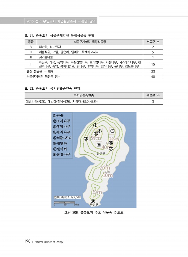2015 전국 무인도서 자연환경조사 통영 권역 198 ? National Institute of Ecology 표 21. 충복도의 식물구계학적 특정식물종 현황 등급 식물구계학적 특정식물종 분류군 수 IV 대반하, 섬노린재 2 III 세뿔석위, 모람, 팔손이, 털머위, 족제비고사리 5 II 갯기름나물 1 I 자금우, 해국, 동백나무, 구실잣밤나무, 보리밥나무, 사철나무, 사스레피나무, 천 선과나무, 송악, 콩짜개덩굴, 광나무, 후박나무, 참식나무, 돈나무, 참느릅나무 15 출현 분류군 수 합계 23 식물구계학적 특정종 점수 40 표 22. 충복도의 국외반출승인종 현황 국외반출승인종 분류군 수 해변싸리 콩과 , 대반하 천남성과 , 지리대사초 사초과 3 ② ③④ ① ⑤ ⑥ ⑦ ⑨ ⑧ ①곰솔 ②소사나무 ③후박나무 ...